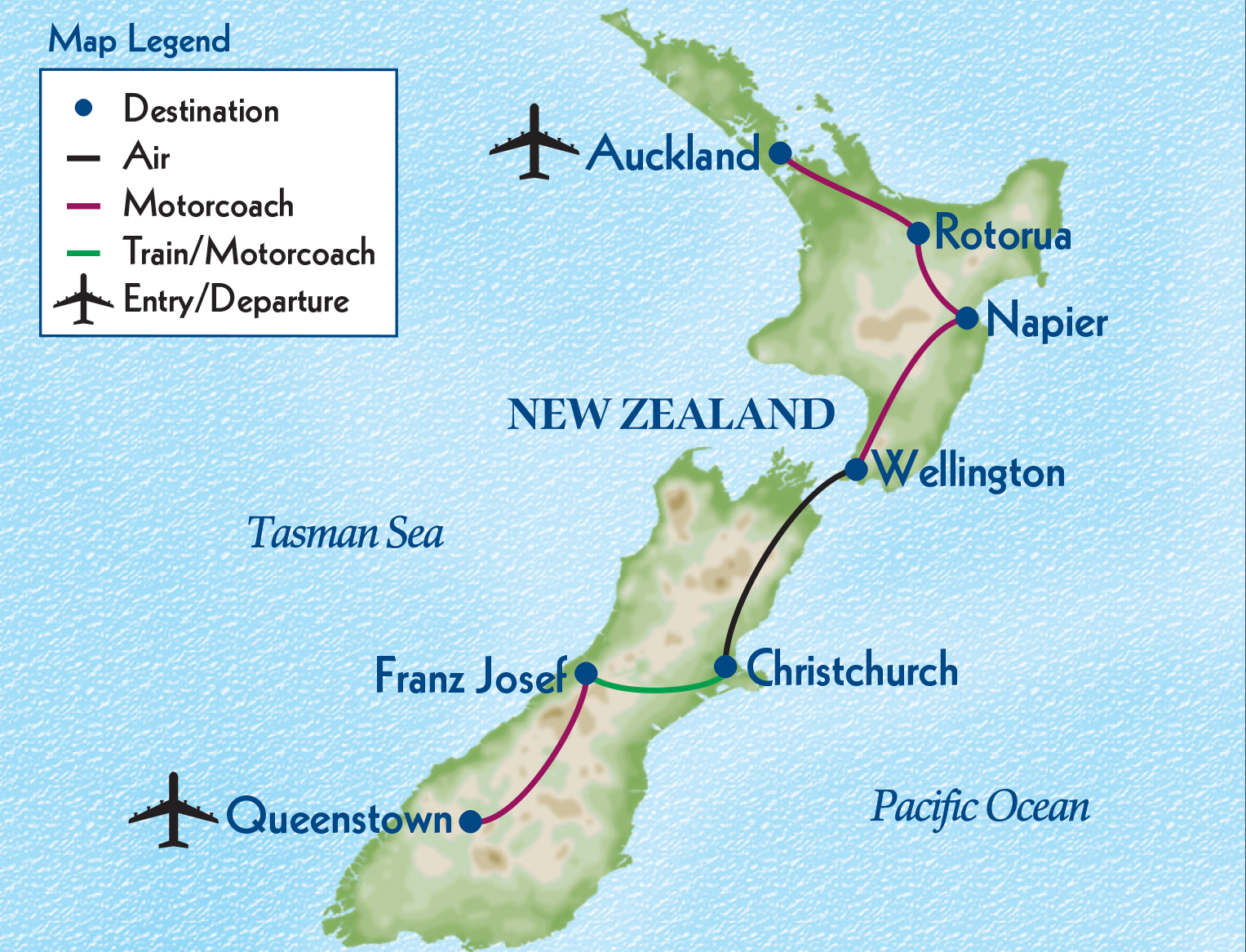 It’s a pure New Zealand experience – a 16-day small group journey traversing the country from north to south, through lively cities and pristine fjords. Cruise cosmopolitan Auckland’s glittering Auckland Harbour and visit the prized Auckland Museum. Discover Rotorua’s intriguing geothermal wonders and experience indigenous Maori culture at a traditional hangi dinner. In Hawke’s Bay, enjoy a tasting at the acclaimed Mission Estate Winery, then take an Art Deco tour in seaside Napier. Watch sheepdogs at work on a farm. Reaching genial Wellington, ride the historic cable car and visit the celebrated national museum. After touring Christchurch, New Zealand’s “Garden City,” embark on a breathtaking TranzAlpine train journey. Encounter the spectacular Franz Josef Glacier on a glacial valley walk and see rare kiwi birds at a wildlife center. On a full-day excursion to Fiordland National Park, cruise through stunning Doubtful Sound. A day at leisure to enjoy scenic Queenstown concludes the adventure.